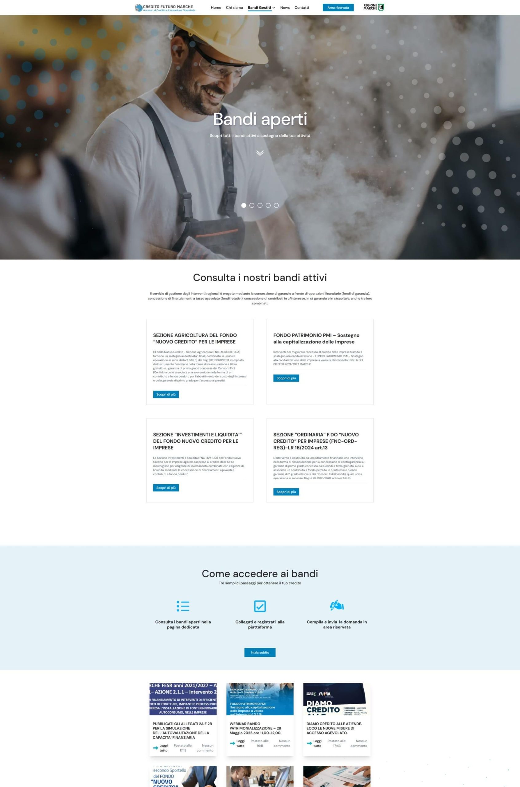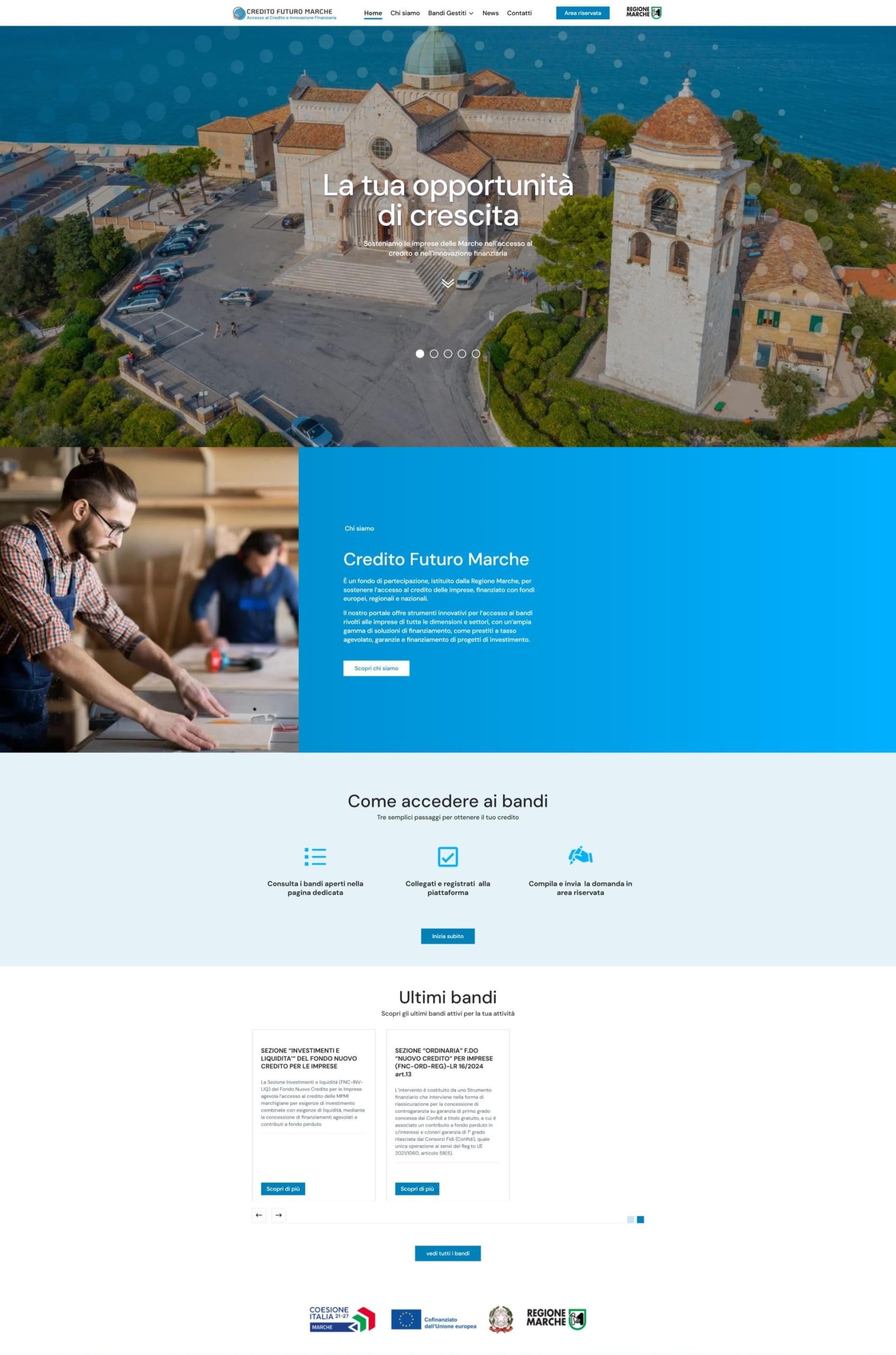 Credito Futuro Marche è un fondo di partecipazione promosso dalla Regione Marche per sostenere l’accesso al credito delle imprese locali. Attraverso bandi e strumenti innovativi, aiuta le aziende a crescere con prestiti agevolati, garanzie e soluzioni finanziarie mirate. Comunica ha curato design e sviluppo UI del sito web, rendendo semplice e immediato l’accesso alle informazioni e ai bandi, così che ogni impresa possa trovare risposte concrete alle proprie esigenze di sviluppo.