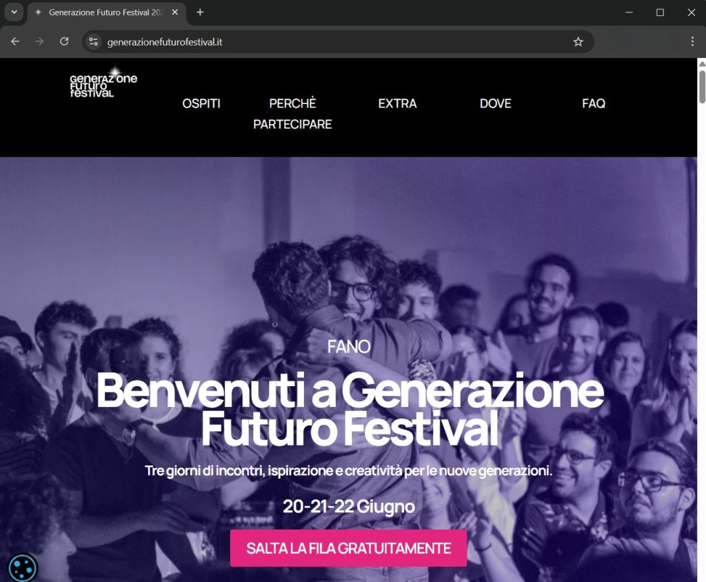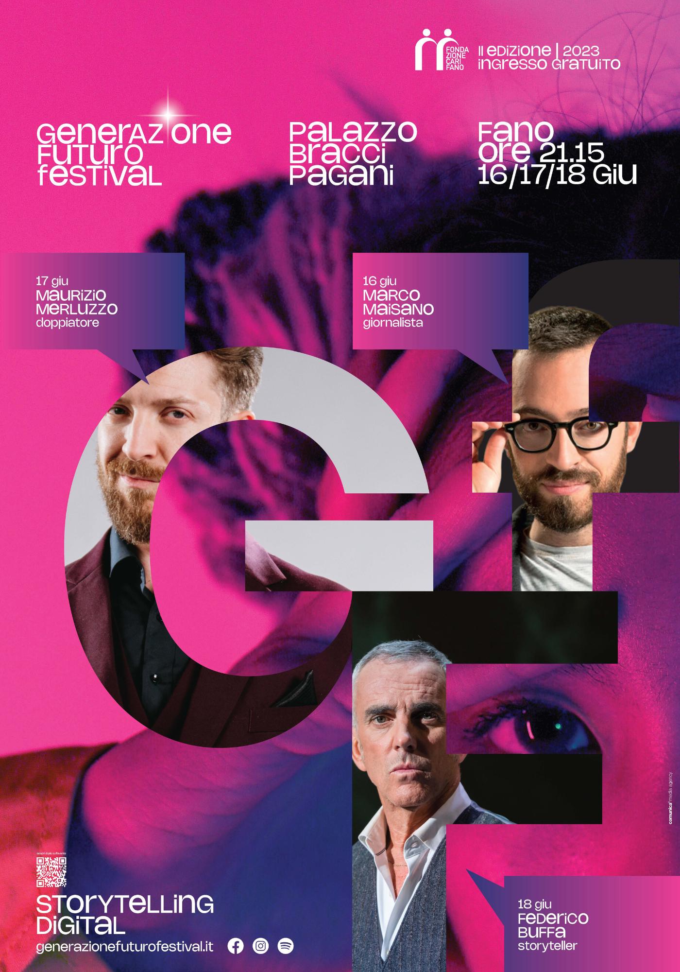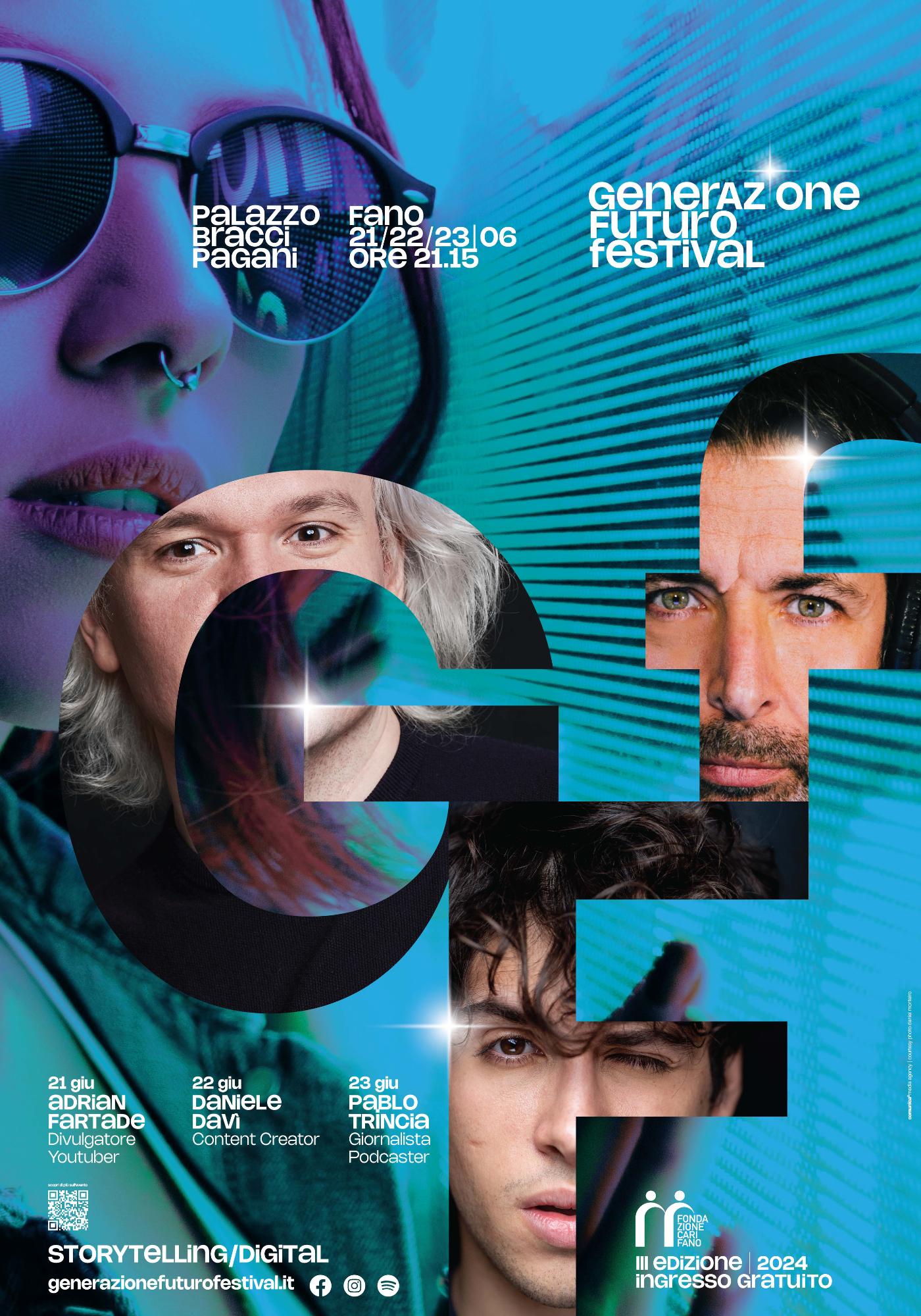 Frutto della nostra organizzazione e del sostegno della Fondazione Carifano, Generazione Futuro Festival è un evento che, coinvolgendo personaggi di calibro nazionale, mette al centro i giovani e i temi che li toccano più da vicino. Talk, laboratori, mostre ed incontri diventano occasioni per riflettere su temi come sostenibilità, piattaforme social e intelligenza artificiale. Da ormai 4 anni ci occupiamo di questo evento a 360°, per costruire un racconto fresco e coinvolgente pensato per - e con - le nuove generazioni.