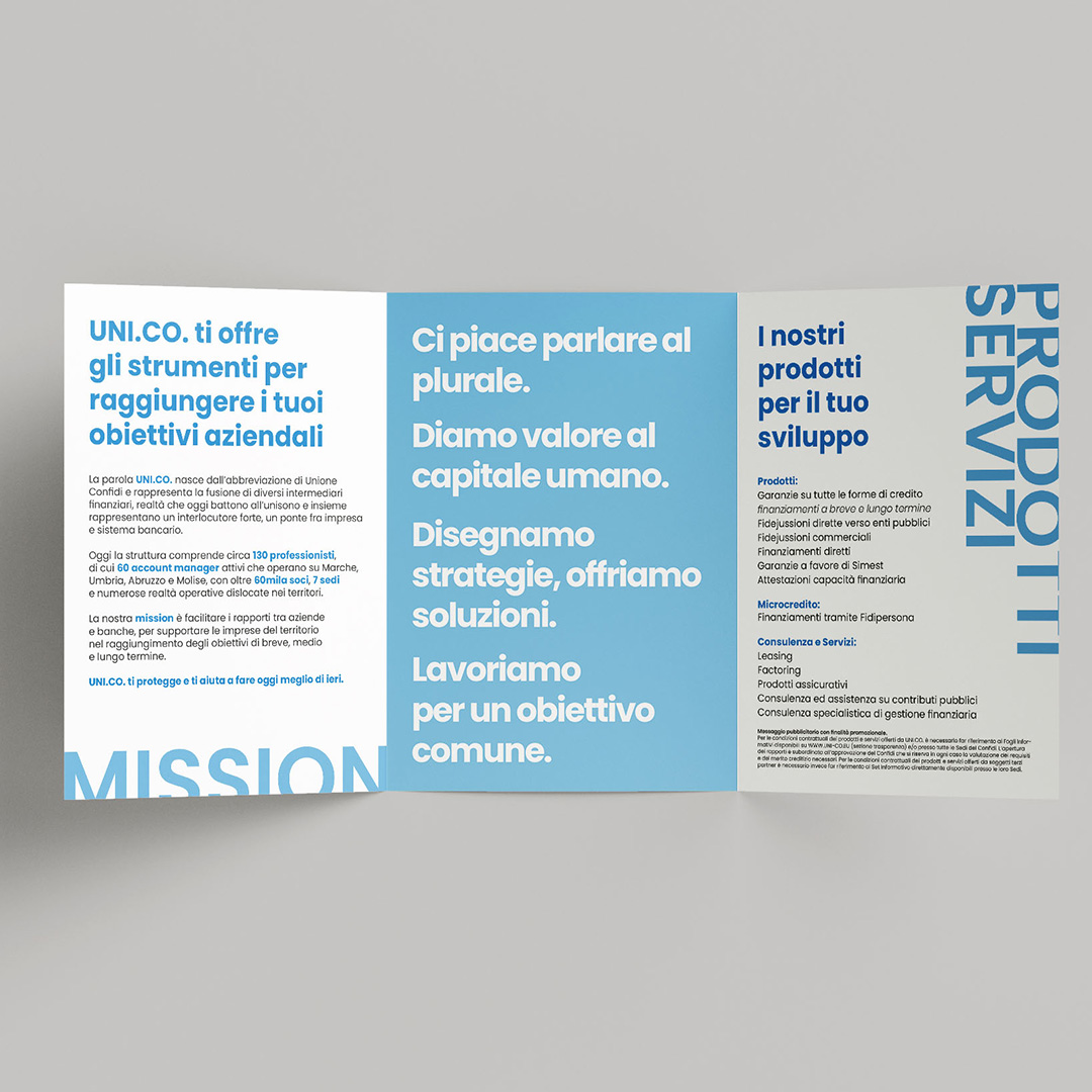 UNI.CO. nasce dall’unione di diversi confidi regionali, diventando oggi un punto di riferimento per oltre 80.000 soci in Marche, Umbria, Abruzzo, Molise e Sicilia. Una struttura solida e capillare, con più di 160 professionisti, che facilita il dialogo tra imprese e sistema bancario offrendo garanzie, credito e consulenza finanziaria. Con Comunica ha rafforzato il proprio branding e la comunicazione istituzionale – dalle campagne agli eventi, dal sito all’ufficio stampa – consolidando la sua immagine di partner affidabile e vicino alle PMI.